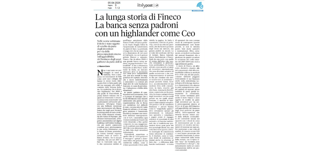 Le informazioni contenute nel presente sito internet sono curate da Andrea Renzoni e non costituiscono in alcun modo raccomandazioni personalizzate rispetto alle caratteristiche del singolo lettore e potrebbero non essere adeguate rispetto alle sue conoscenze, alle sue esperienze, alla sua situazione finanziaria ed ai suoi obiettivi di investimento. Le informazioni contenute nel presente sito internet sono da intendersi a scopo puramente informativo. Trattasi di informazione standardizzata rivolta al pubblico indistinto (cfr. art 69, comma 1, punto c, Regolamento Emittenti Consob e considerando n.79 della direttiva Mifid 2006/73/CE), con lo scopo di offrire un supporto informativo e decisionale ai propri lettori e ai clienti mediante l’elaborazione di un flusso informativo di testi, dati, notizie, ricerche e analisi attraverso le varie pubblicazioni. FinecoBank S.p.A. non si assume alcuna responsabilità in merito alla correttezza, alla completezza e alla veridicità delle informazioni fornite.